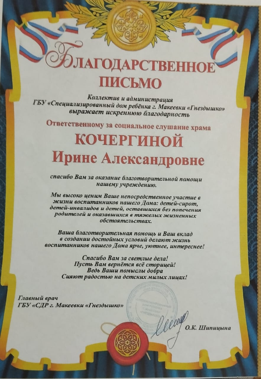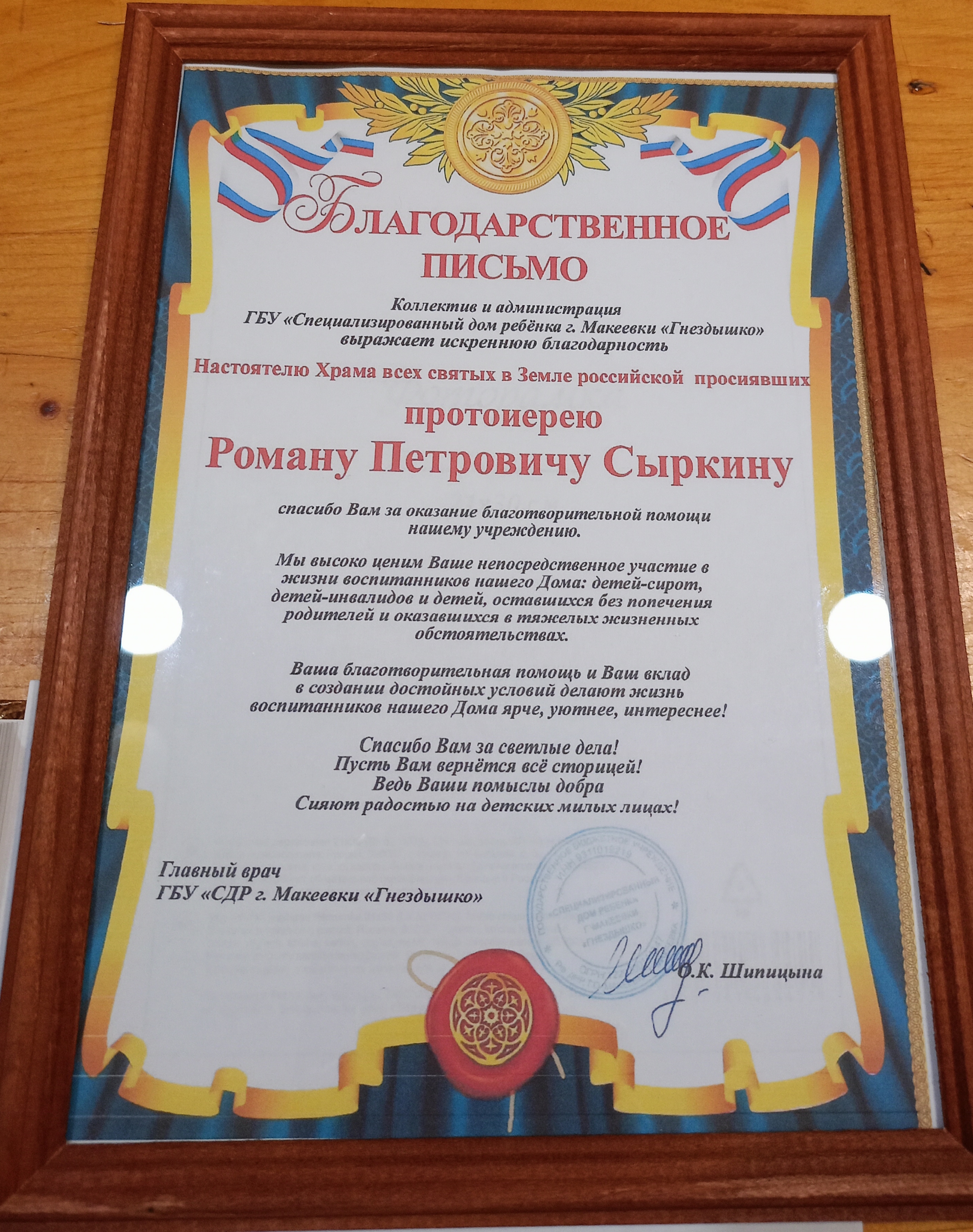 Прихожанами храма Всех святых в земле Русской просиявших города Белоозерского неоднократно была собрана гуманитарная помощь для ГБУ " Специализированный дом ребенка г.Макеевки "Гнездынки". 22 октября 2025 года настоятелю храма протоиерею Роману Сыркину и прихожанке Ирине Кочергиной, ответственной за социальное служение в храме, были вручены благодарственные письма от администрации и коллектива интерната за оказание благотворительной помощи данному учреждению. Волонтер Ирена привезла письма из города Макеевки Донецкой области. Воспитанники Дома: дети-сироты, дети-инвалиды и дети, оставшиеся без попечения родителей и оказавшиеся в тяжелых жизненных ситуациях.
