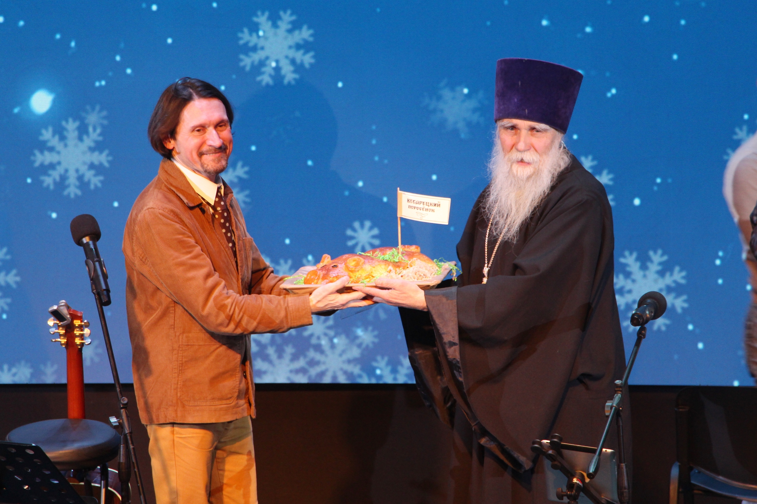 Григорий Данской и настоятель храма Всех святых, в земле Российской просиявших, протоиерей Роман Сыркин открыли тайну названия концерта. В первый день так называемого Старого Нового года - 14 января - Церковь отмечает память святителя Василия Великого, архиепископа, жившего в четвёртом веке в Кесарии Каппадокийской (территория современной Турции). Очень давно сложилось почитание Василия Великого как небесного заступника свинопасов, пастухов. Поэтому в "Васильев день" было принято запекать поросёнка, и это блюдо называлось "Кесаретским поросёнком". По этому поводу о. Роман подарил артистам почти в буквальном смысле "молочного" поросёнка, выпеченного из творожного теста.