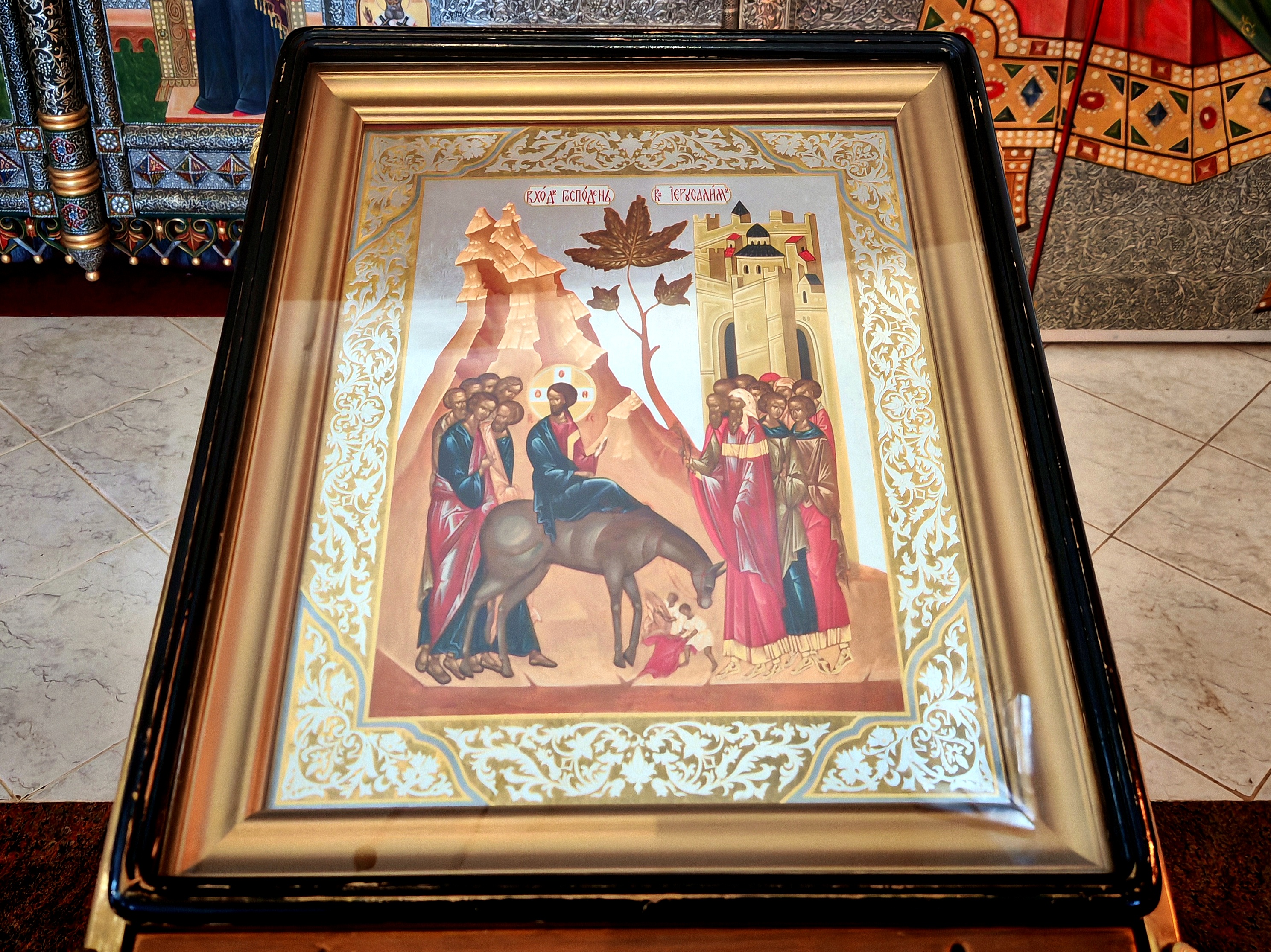 "Вход Господень в Иерусалим. В этот день «весь город пришел в движение, и говорили: кто Сей?» (Мф.21:10) Господь въезжал в город, сидя на молодом осле. А множество «народа постилали свои одежды по дороге, а другие резали ветви с дерев и постилали по дороге» (Мф.21:8). Другие же «взяли пальмовые ветви, вышли навстречу Ему и восклицали: осанна! Благословен Грядущий во имя Господне, Царь Израилев!» (Ин.12:23) Мало того: даже «из уст младенцев и грудных детей» (Мф.21:16) раздавалась хвала.